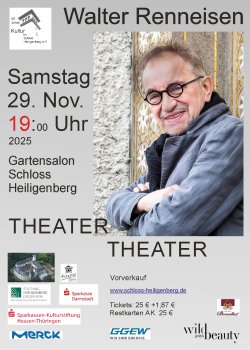 Traditionell beginnt der Verein die Adventszeit mit Walter Renneisen. In diesem Jahr zeigt er erstmals sein neues Programm THEATER-THEATER und gibt Geschichten, die vor und hinter der Bühne spielen preis. Erlebnisse, pikante, schöne, aber auch hässliche Seiten. Natürlich darf die Musik nicht zu kurz kommen, "Live natürlich"!
