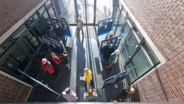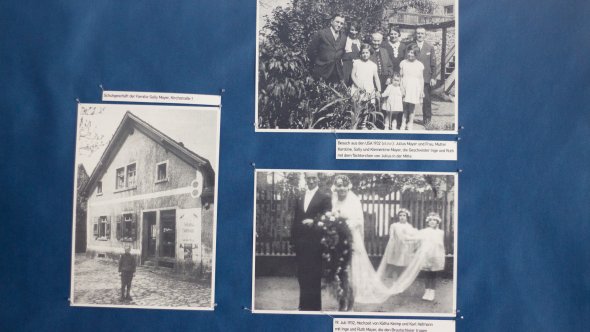 Es bedarf einiger Phantasie, Organisationsgeist und starke Nerven, um unsere Hör-Ausstellung ins Werk zu setzen. Von der abrollbaren ozeanblauen Tischdecke, mit der wir die grauen Stellwände der Gemeinde einheitlich grundieren, über die verschiedenen Rahmen aus der Werkstatt Sonne - danke hierfür! - bis zur Holzleiter aus einem Kinderzimmer, auf die wir unsere "Hör-Tafel" kleben, damit die Besucher*innen orientiert sind, welcher Beitrag gerade läuft. - Der Bärenanteil der Arbeit liegt bei Sabine, die von Gemeindeseite aus tätig ist, doch auch die anderen sind nicht faul, drucken Fotos und Dokumente aus, schreiben Bildunterschriften, es wird richtig handwerklich zum Schluss. Schneiden und das Bild- und Textmaterial mit Eisbärnadeln aufstecken, jede Biografie bekommt eine Stellwandseite. Als die Türen am Holocaust-Gedenktag aufgehen, strömen viele Menschen herein, auch deswegen, weil es etwas zu feiern gibt: Klaus Knoche bekommt die Verdienstplakette der Gemeinde Seeheim-Jugenheim für sein ehrenamtliches Engagement für die Stolpersteine! Nach der Ehrung verteilen sich die Besucher*innen in den Foyers, studieren die Stellwände, setzen sich auf die 13 Stühle im Hörraum, manche bleiben lange, einer die ganze Zeit. Eintauchen in die Schicksale der Jüdinnen und Juden aus Seeheim-Jugenheim, sich einlassen, das geschieht hier. Auch am nächsten Tag ist die Ausstellung gut besucht, und immer wieder hören wir: "Was, nur zwei Tage? Das sollte länger zu sehen sein!"