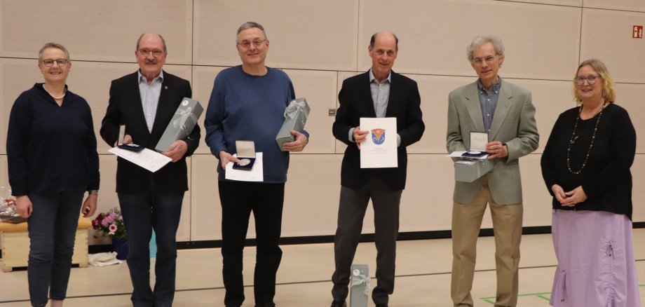 Auf dem Bild: Bürgermeisterin Birgit Kannegießer und Suse Bruer, Vorsitzende der Gemeindevertretung, mit vier der Geehrten, die für ihr 20-jähriges Engagement als politische Mandatsträger mit der Verdienstplakette der Gemeinde ausgezeichnet wurden: Wolfgang Weber, Wolfang Sonntag, Jürgen Neipp und Xavier Marc (v.l.n.r.). Nicht mit auf dem Bild: Giulio Mollo.