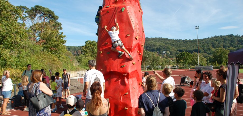 Neben vielen Vereinen und Institutionen hat sich auch der Familienbeirat der Gemeinde mit einem Angebot beim Weltkindertag am 20. September im Christian-Stock-Stadion beteiligt, bei dem großer Andrang herrschte. Ein Kletterfelsen bot den Kindern die Möglichkeit, ihre Kletterfertigkeiten auszuprobieren - während die Eltern mit den Mitgliedern des Familienbeirats ins Gespräch kommen konnten.