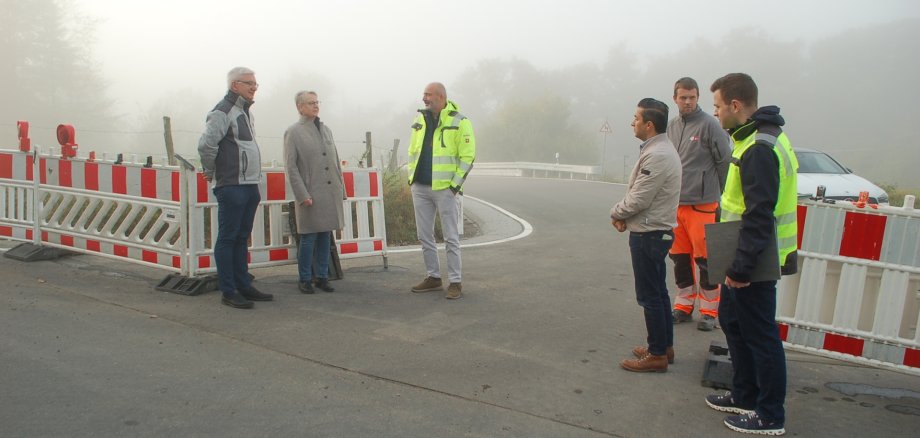 Auf dem Bild (v.l.n.r.): Bürgermeisterin Birgit Kannegießer bei der Abnahme der Höhenstraße am 29. September mit Jochen Westerholt (Peter Gross Bau), Axel Schönrock (Golükes Ingenieure), Jawad Ahmad (PGB), Benedikt Raupach (PGB) und Maximilian Knapp (GI).