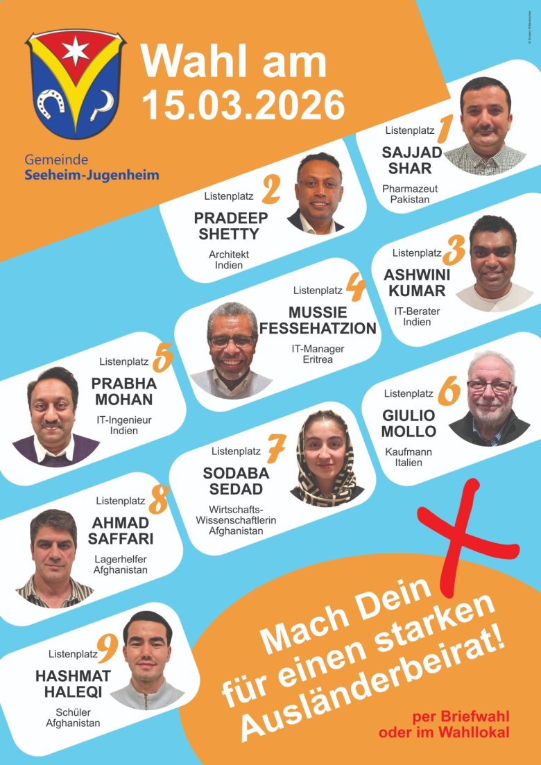 In Seeheim-Jugenheim wird bei der Kommunalwahl am 15. März wieder ein Ausländerbeirat gewählt. Der Beirat ist beratend tätig bei allen Angelegenheiten, die Ausländer in der Gemeinde betreffen, und gestaltet Integration mit. Neun Kandidaten stehen zur Wahl!